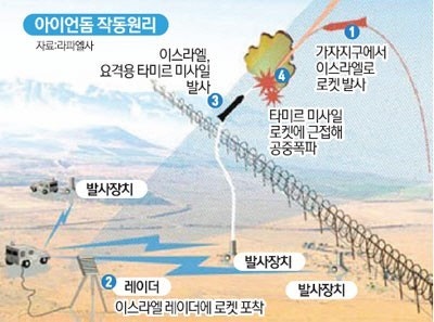 아이언돔은 이스라엘 방산업체 라파엘(Rafael Advanced Defense Systems)이 개발한 단거리 미사일 요격 시스템입니다. 팔레스타인 무장단체 하마스가 발사한 로켓을 실시간으로 탐지하고, 위협도를 분석해 요격 미사일을 자동 발사하는 첨단 기술로, 2011년부터 실전에 투입되었으며 90% 이상의 요격 성공률을 기록하고 있습니다.
